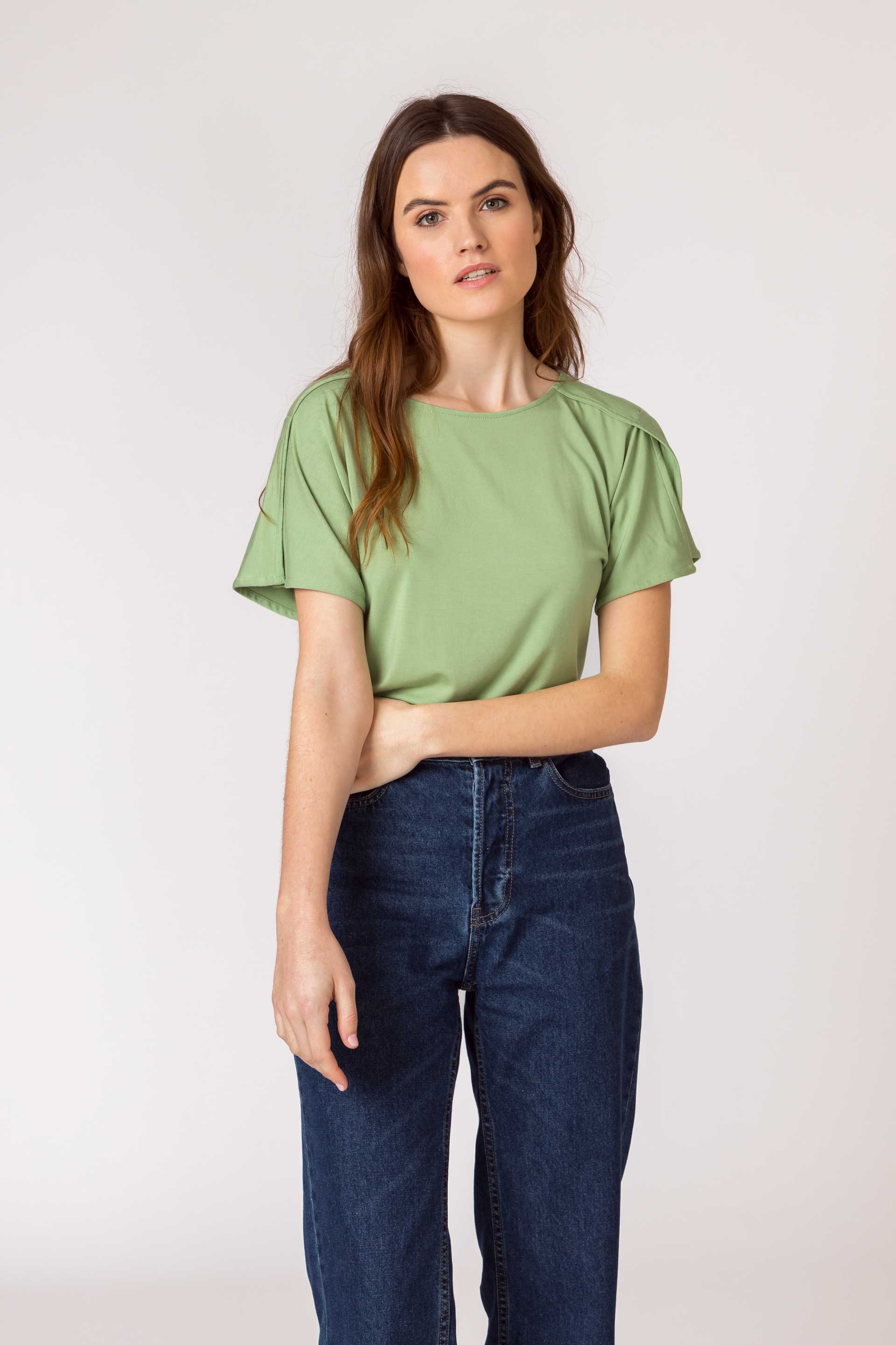 Short-sleeve loose T-shirt and rounded neck in mauve, a little colour splash to your summery looks.